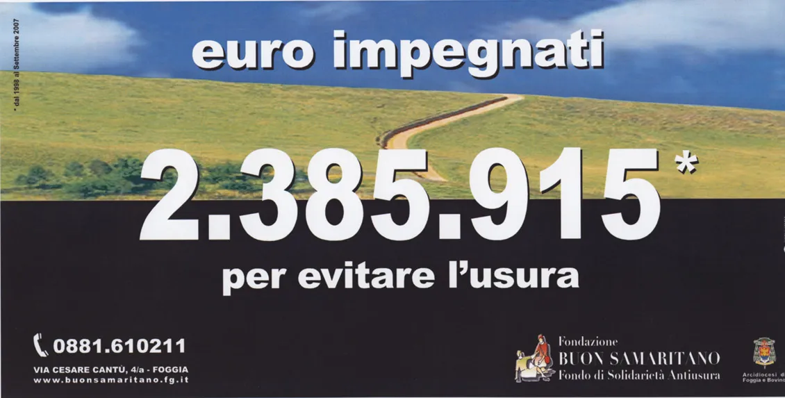 Un’immagine forte, oscura, che rappresenta il senso di oppressione, solitudine e disperazione vissuto da chi è intrappolato nel vortice dell’usura. Stampato in formato 100×140, è stato affisso nei punti chiave delle città della Capitanata.