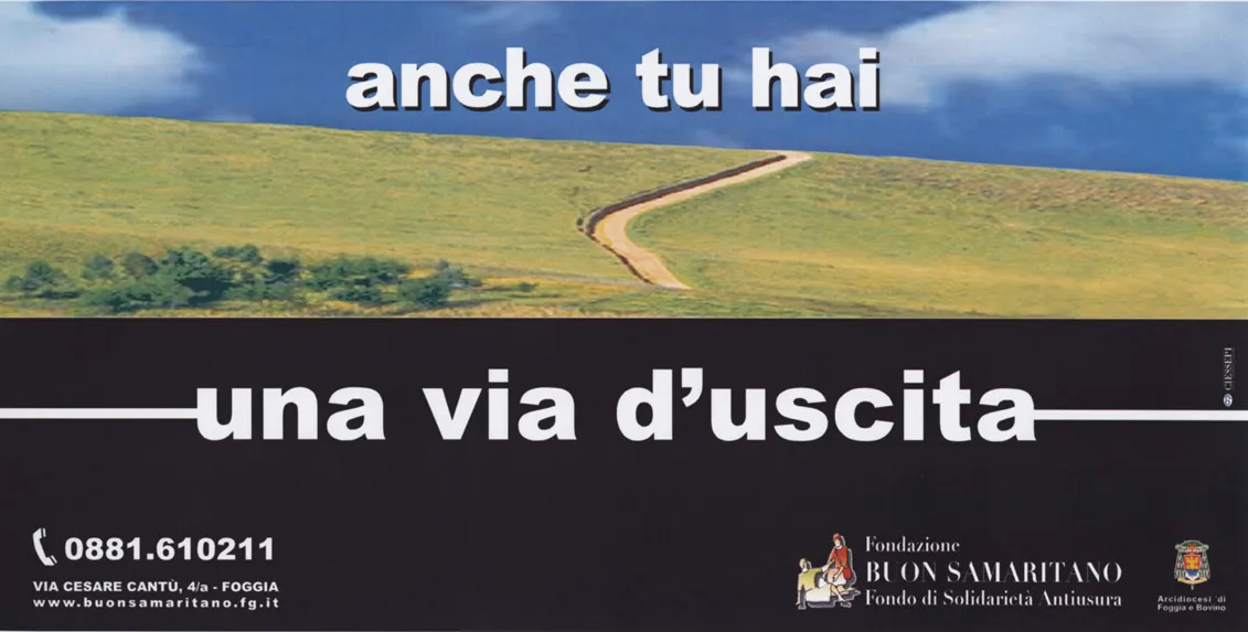 Dopo alcuni giorni, una nuova affissione ha svelato il messaggio di speranza: “Questo è ciò che potrai vedere rivolgendoti alla Fondazione Buon Samaritano: Una via d’uscita.” Una luce che si apre, concreta e reale, per chi trova il coraggio di chiedere aiuto. È la voce della Fondazione, vicina, presente, possibile.